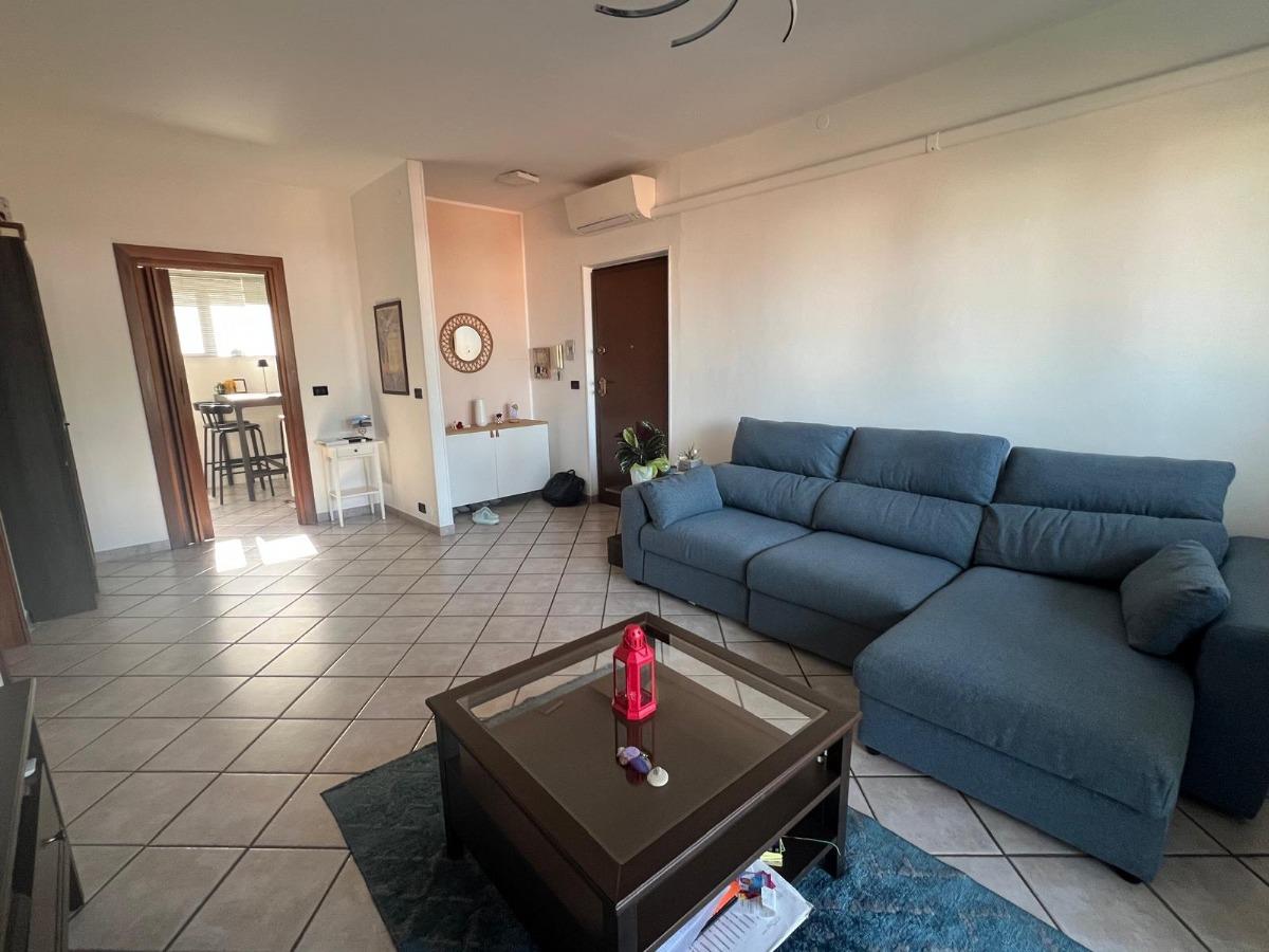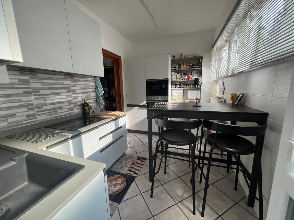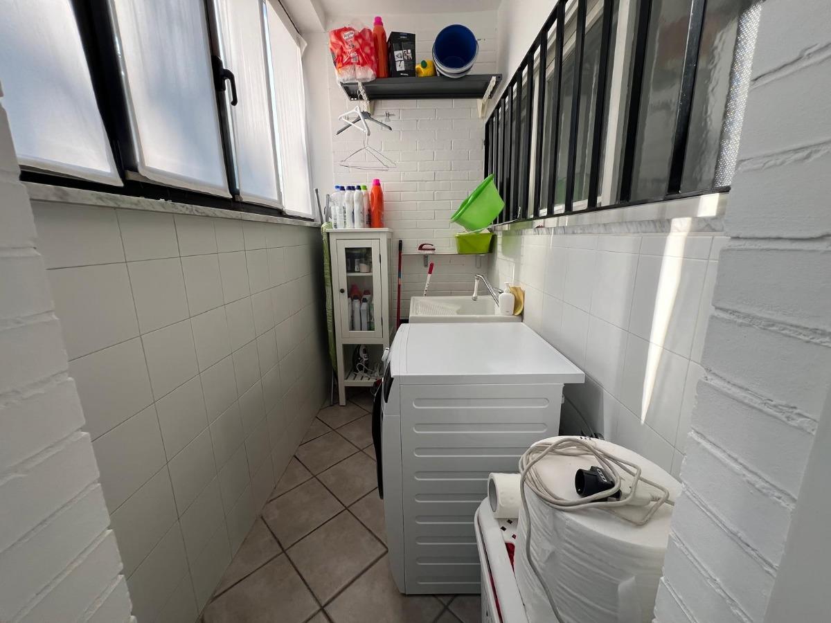 L'ingresso si affaccia sulla zona giorno dove troviamo una sala con climatizzazione inverter e balcone con tende da sole, cucina con balcone verandato ad uso lavanderia.