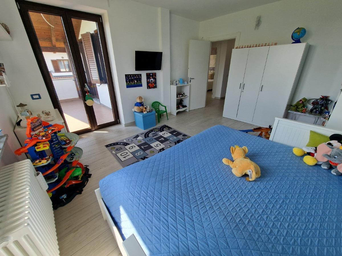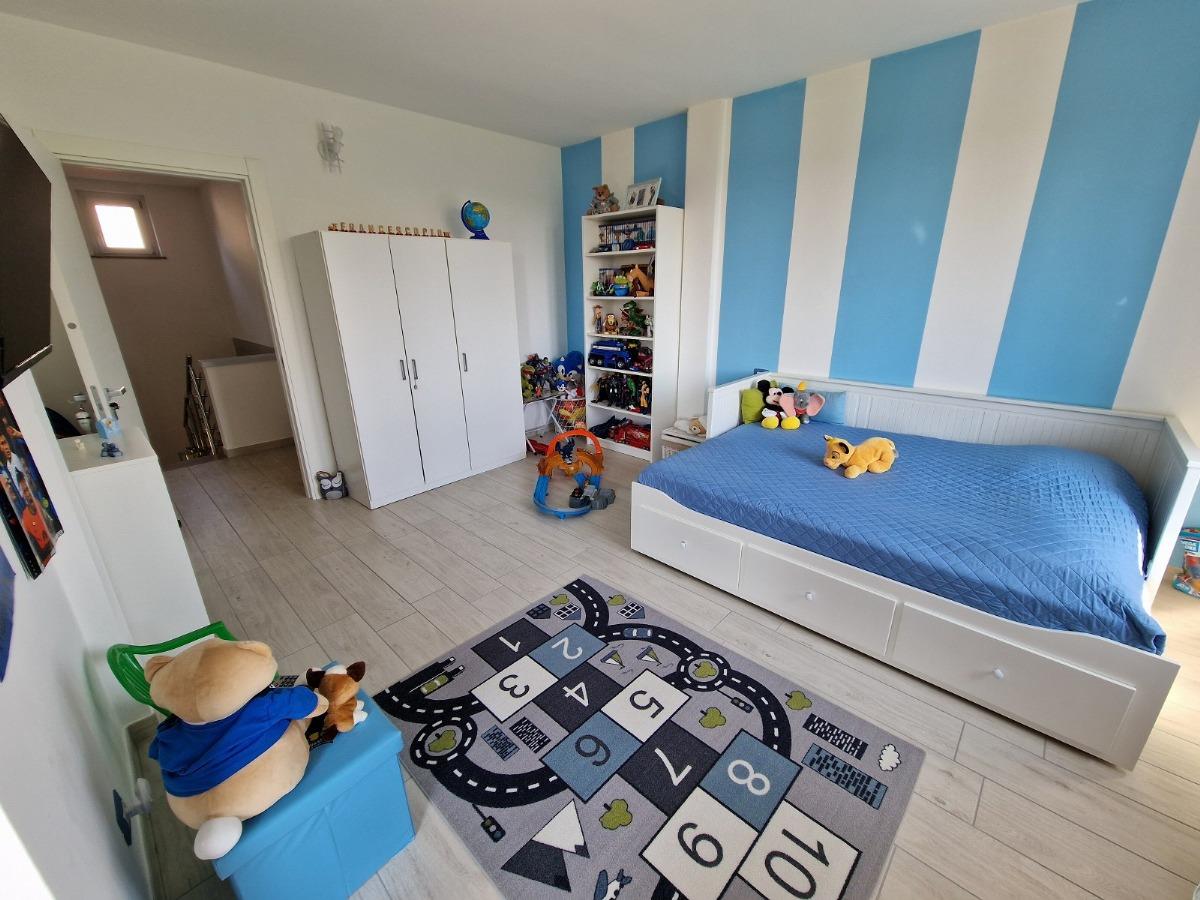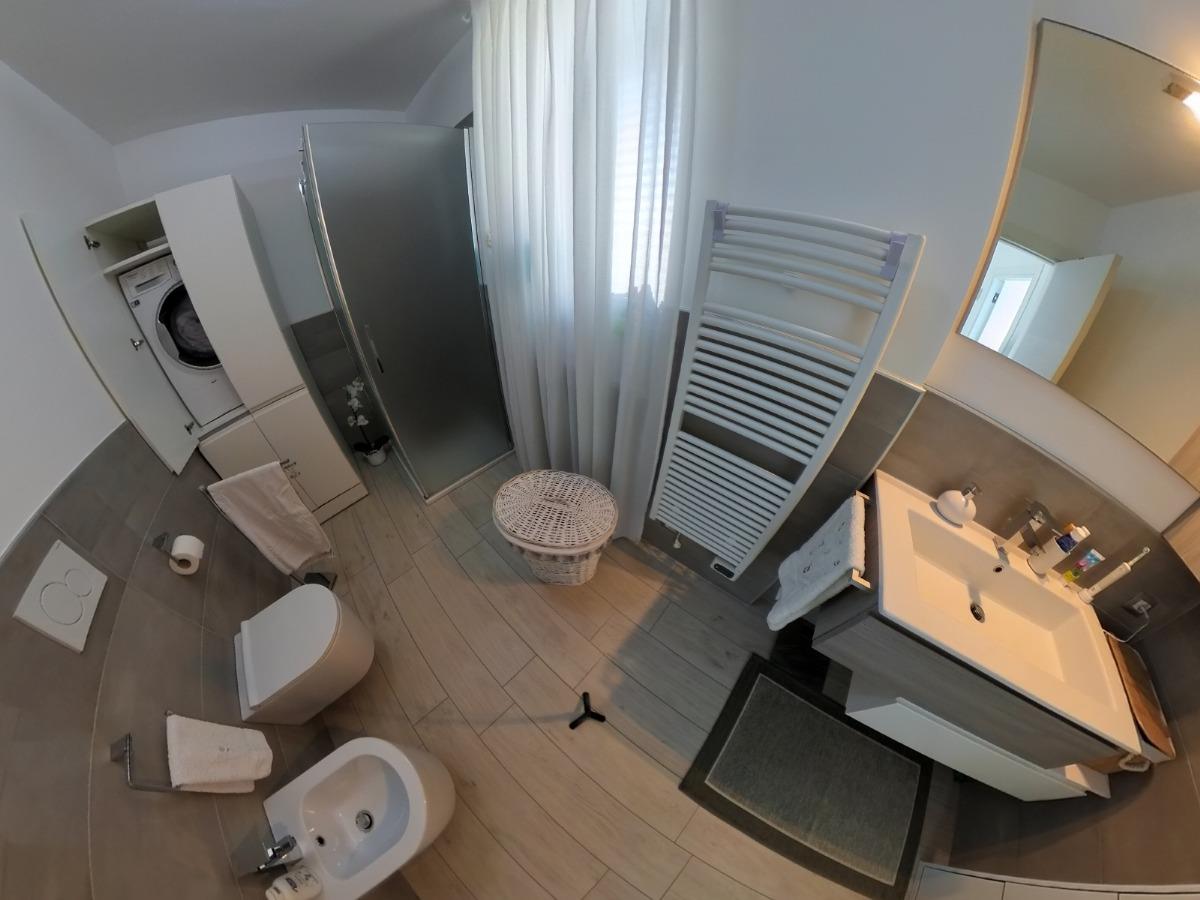 Salendo la scala arriviamo al disimpegno del primo piano, dedicato alla zona notte; qui troviamo tre camere da letto, tutte di generose dimensioni, due affacciano su un bel terrazzo coperto ed una è dotata di balcone privato;vi è poi un secondo bagno con box doccia, provvisto anche degli attacchi per la lavatrice.